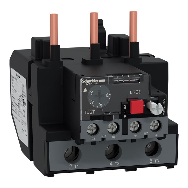 O relé LRE é um relé de sobrecarga térmica diferencial para uso com fusíveis ou disjuntores magnéticos GV2 L e GV3 L. Sua faixa de ajuste térmico é 30-40A 50/60Hz e a classe de disparo é 10A em conformidade com IEC 60947-4-1. Pode ser montado diretamente em contatores EasyPact TVS com conexão de terminais de grampo de parafuso. Protege cargas desbalanceadas e motores de 18,5kW a 400VAC. Fornece reinicialização manual ou automática, contato auxiliar de trip e indicador de bandeira. Disponível em todo o mundo, é certificado por vários padrões (IEC, UL, CSA, CCC, EAC, Marine) e compatível com Green Premium (RoHs/Reach).